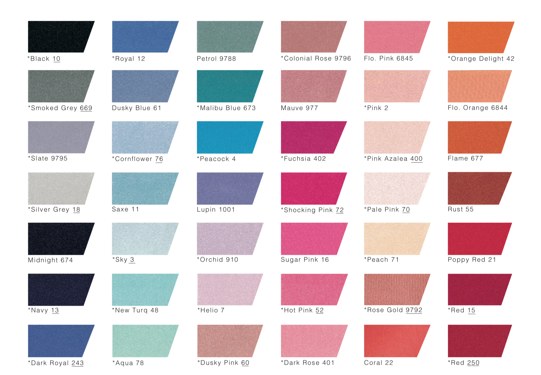 White 1, Pink 2, Sky 3, Peacock 4, Lemon 5, Helio 7, Black 10, Saxe 11, Royal 12, Navy 13, Pale Lemon 14, Red 15, Sugar Pink 16, Wine 17, Silver Grey 18, Purple 19, Old Gold 20, Poppy Red 21, Coral 22, Emerald 23, Bottle Green 24, Dark Brown 25, Gold 37, Orange Delight 42, Ecru 45, New Turquoise 48, Plum 49, Cream 50, Hot Pink 52, Rust 55, Mint 56, Dusky Pink 60, Dusky Blue 61, Jade 68, Pale Pink 70, Peach 71, Shocking Pink 72, Cornflower 76, Aqua 78, Moss 79, Khaki 80, Dark Royal 243, Red 250, Pink Azelea 400, Dark Rose 401, Fuchsia 402, Burgandy 405, Topaz 412, Bridal White 419, Hunter Green 455, Meadow 664, Smoked Grey 669, Marigolds 672, Malibu Blue 673, Midnight 674, Flame 677, Honey Gold 678, Yellow 679, Scarlet Berry 908, Orchid 910, Liberty 952, Forest 969, Mauve 977, Cypress 980, Lupin 1001, Straw 6835, Blackberry 6841, Flo Orange 6844, Flo Pink 6845, Flo Yellow 6846, Flo Green 6847, Petrol 9788, Pearl 9790, Rose Gold 9792, Apple 9793, Taupe 9794, Slate 9795, Colonial Rose 9796, Lilac Mist 9797, Mulberry 9798